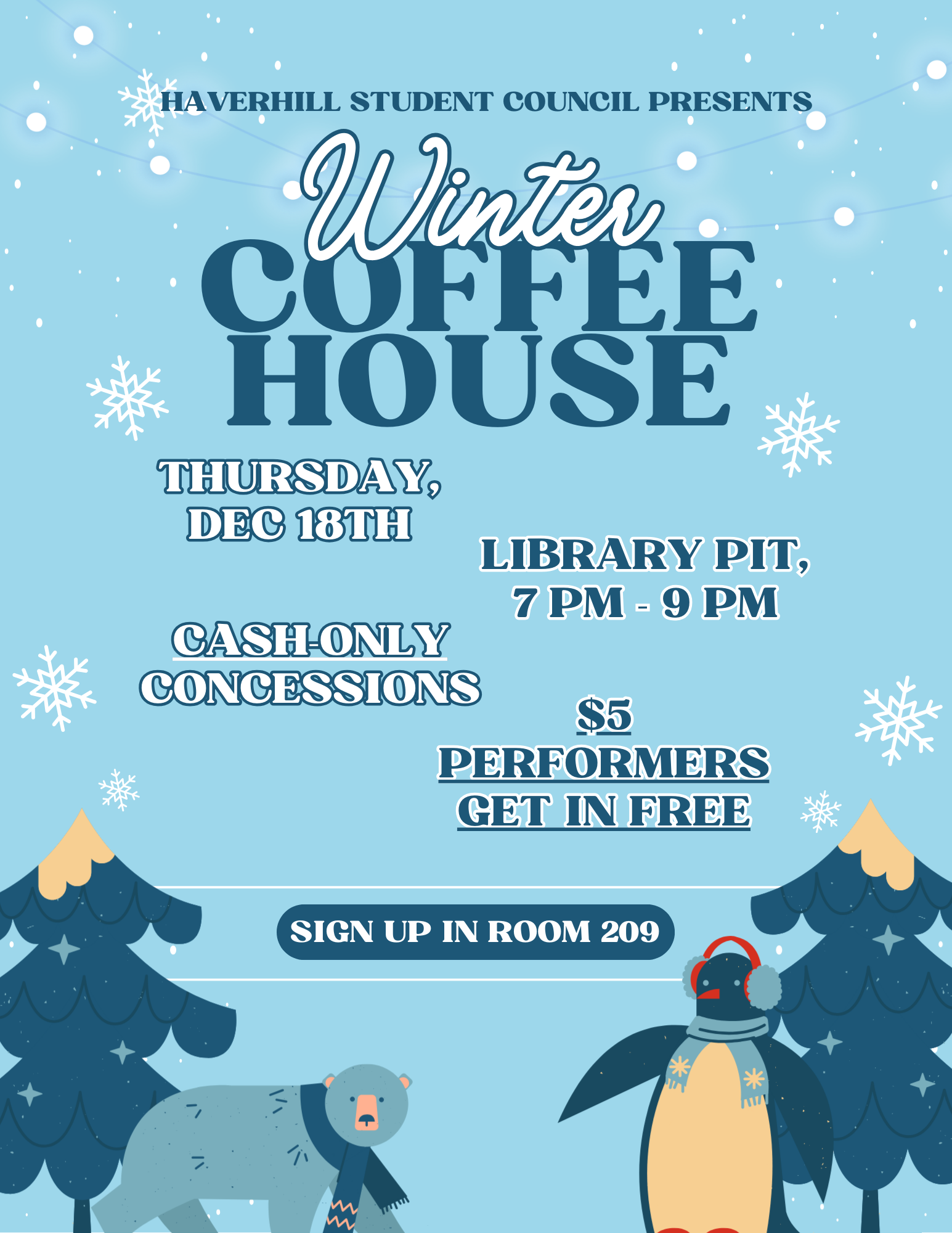 Haverhill High student council presents… THE WINTER COFFEE HOUSE! Live entertainment from our talented HHS students! (Singing, Poetry, Acting, Dancing, Playing instruments, among other talents!) Thursday December 18th 7-9pm in the HHS library pit! $5 admission and free admission for performers! Performers can sign up in room 209! Cash-only concessions will be available during the show!