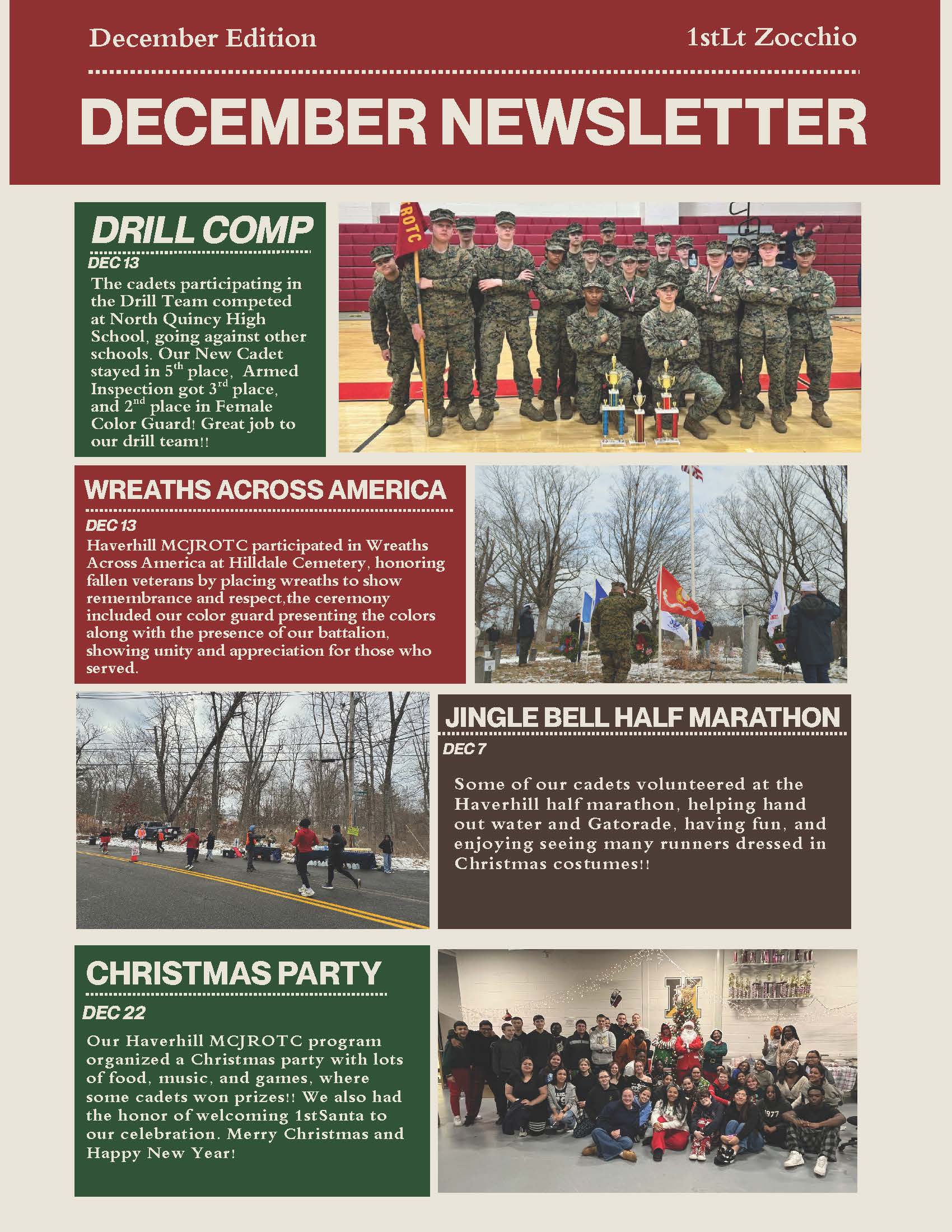 Your Marine Corps JROTC did very well in their first drill competition of the year earning 3 more trophies for their tropy table and bringing their total to 32 trophies for the months of October, November and December. Congratulations to the commanders Cadet GySgt Hannon, Cadet SSgt Gomez and Cadet Sgt McGrath. We also had 50 Cadets participate in the Wreaths across America Event on Saturday. Thank you for the continued Support.