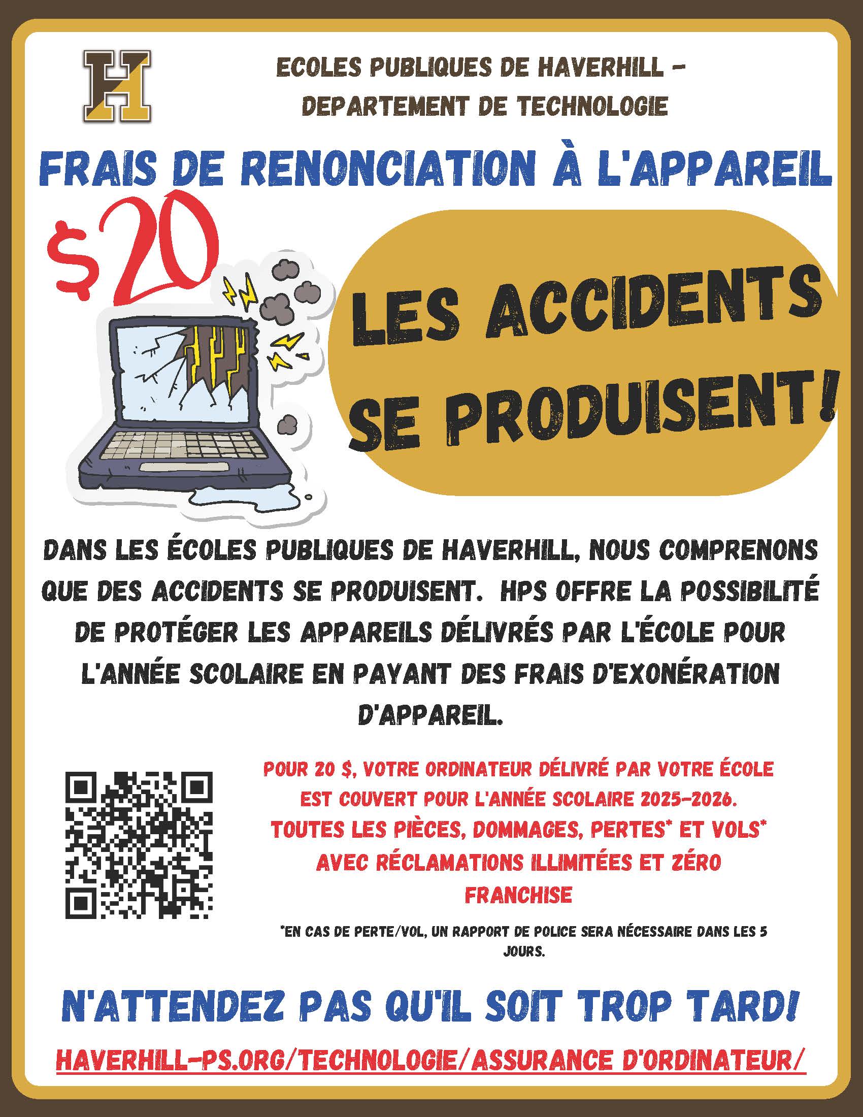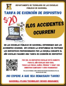 As part of the District’s 1:1 initiative, every Haverhill Public Schools student receives a HPS-issued Chromebook. HPS offers the opportunity to protect school-issued devices for the school year by paying a Device Waiver Fee. As outlined in the HPS Student Technology Device Policy, this $20 fee will help to cover the costs of potential damage, repair, or loss for the school year for the assigned device. Click below for more information.